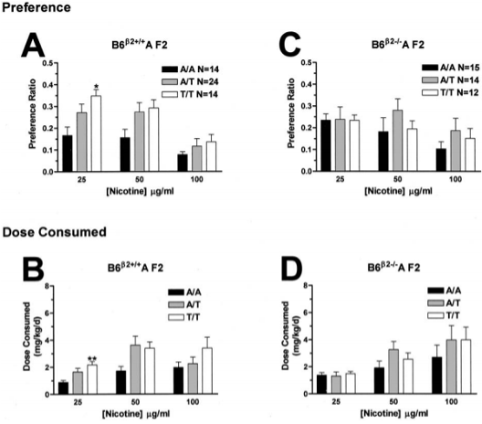 Using a two-bottle choice preference protocol, singly housed animals are given a choice between an aqueous compound in water and water itself. Depending on the compound and potentially adverse effects of taste, a vehicle solution of 0.3% sucrose may be used. Animals begin with a low dose of the compound, the dose will increase every four days, and the highest dose will occur from days 8-12. The positions of the two bottles on the animal cage will be switched daily to reduce side preferences.