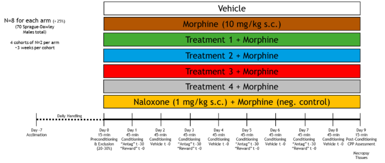 Conditioning will proceed over 8 days of alternating treatments (days 1, 3, 5 and 7) with vehicle control (days 2, 4, 6 and 8). The treatments will include vehicle negative control, morphine positive control (10 mg/kg s.c.), and the other arms will be up to the client. Agents hypothesized to modify the acquisition of morphine CPP will be administered 30 minutes before conditioning, while morphine will be provided immediately before conditioning. Each conditioning session will occur once per day, last for 45 minutes, and the animal will be confined to the same context for both the entire session and for all treatment conditioning days. On vehicle control days, the animal will be paired to vehicle in the alternative context. The animals in each group will be counterbalanced in that 50% of non-excluded animals will have the treatment paired to one context, while the remaining 50% will have the treatment paired to the other context. Such counterbalancing will also occur in the vehicle negative control group.